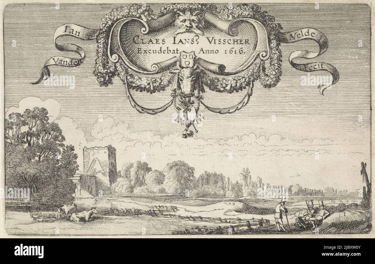 Resting Figures In A Landscape With Cows And A Tower At Top A Cartouche With The Title At The Bottom Of The Cartouche A Head Of A Bull On Which Are Painting
